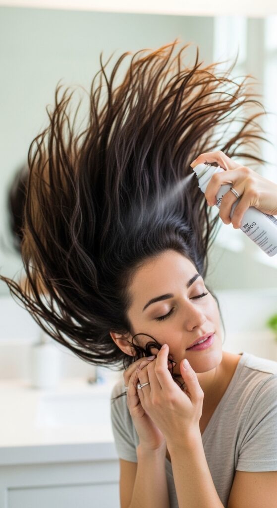 1. Root Spray & Flip: Spray dry shampoo at the roots. Flip your head over, brush through from underneath, and flip back.
