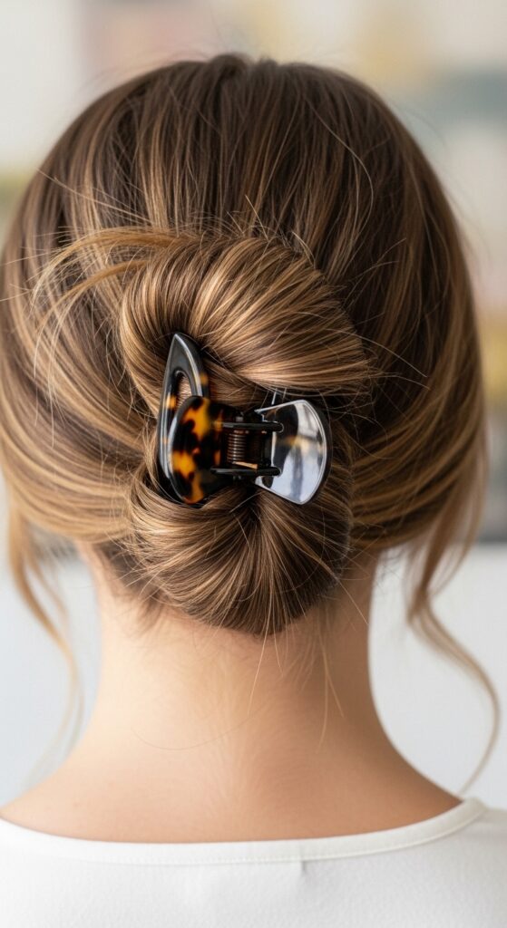 • The Low Twist & Clip: Gather hair at the nape, twist once, fold up, and secure with a large claw clip. Pull out a few pieces.