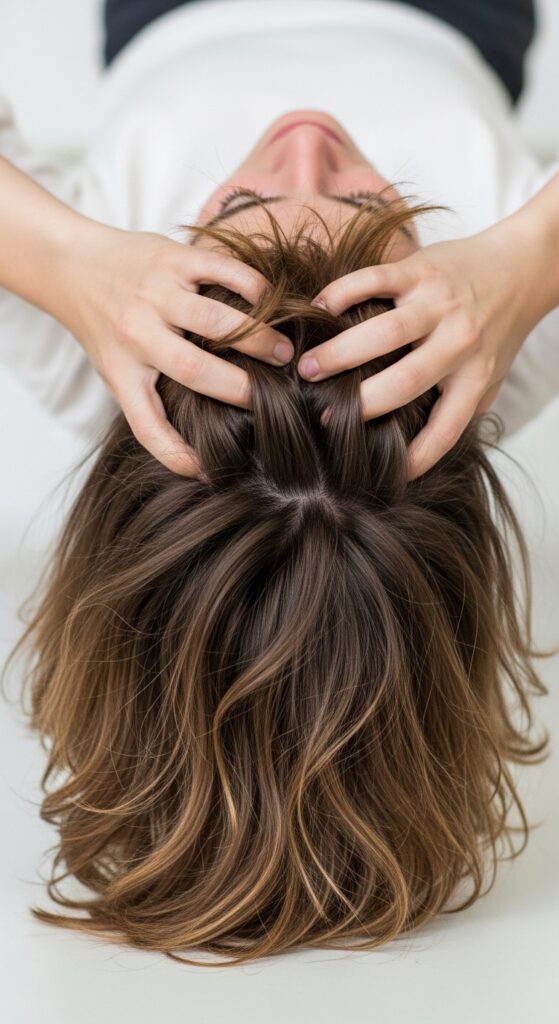 Second-day hair can have the best volume, if you refresh it right. Start by flipping your head completely upside down. Gently massage your scalp with your fingertips to break up any settled oils.