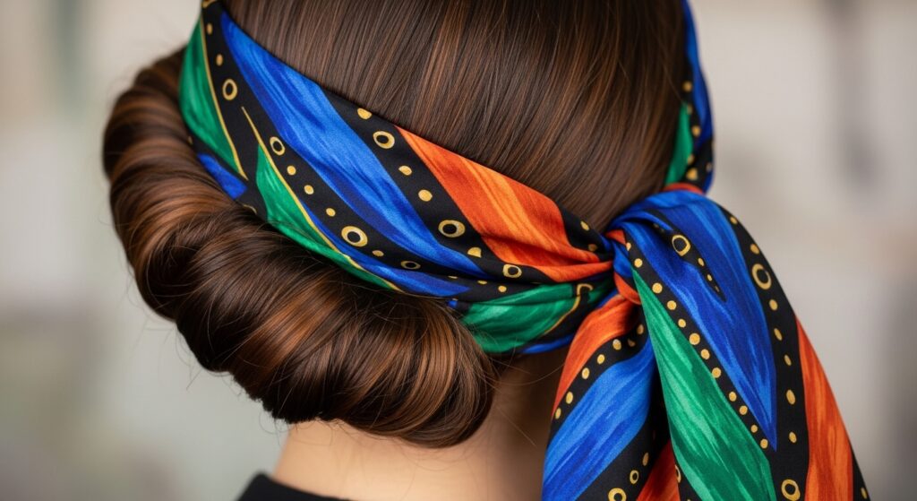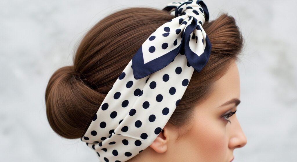 A vintage-inspired look that’s surprisingly modern. The Gibson tuck is inherently elegant, and adding a scarf as the “band” gives it a fresh, contemporary twist. It works on shorter hair too.