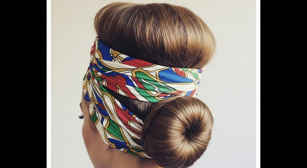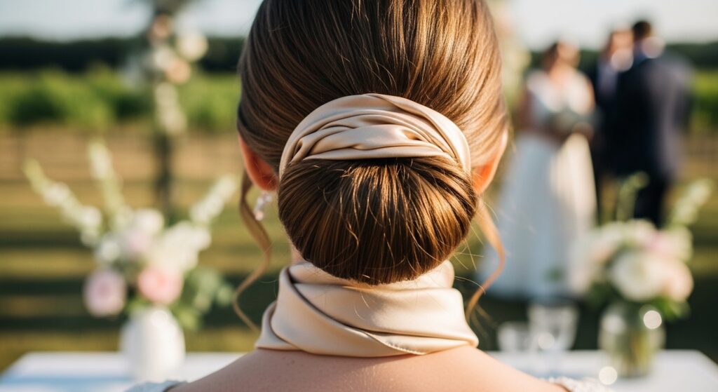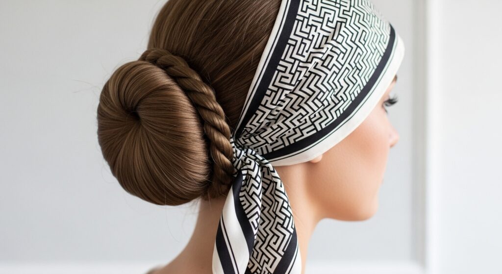 For those “I need to look elegant but I’m melting” occasions. This low, wrapped chignon is your best friend. It’s sleek, it’s secure, and the scarf detail looks intentional and polished.