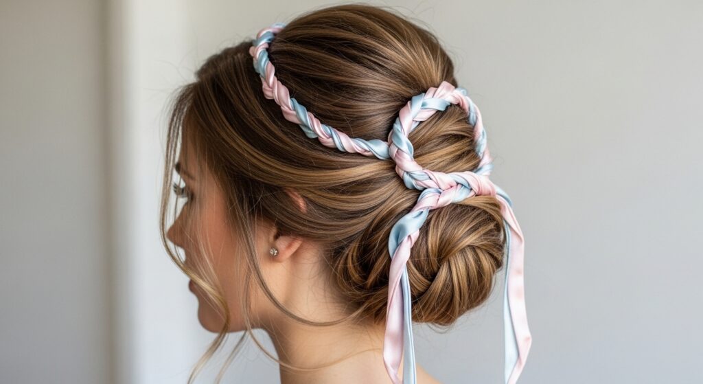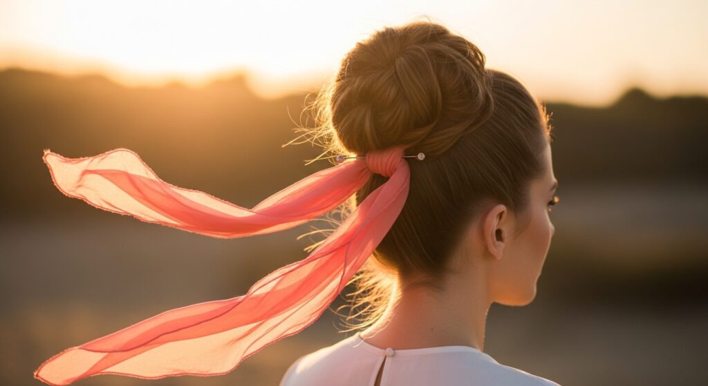 Pull the top section of your hair back, as if making a half-up style. Use a delicate, thin scarf to tie this section, creating a small, soft pouf. Then, incorporate the ends of the scarf into a low bun with the rest of your hair.