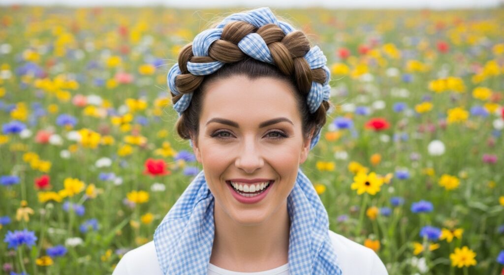 Create two low pigtails. Braid each one, incorporating a long scarf into one section of each braid from the start. Then, cross the braids over the top of your head like a crown, pinning them securely in place.