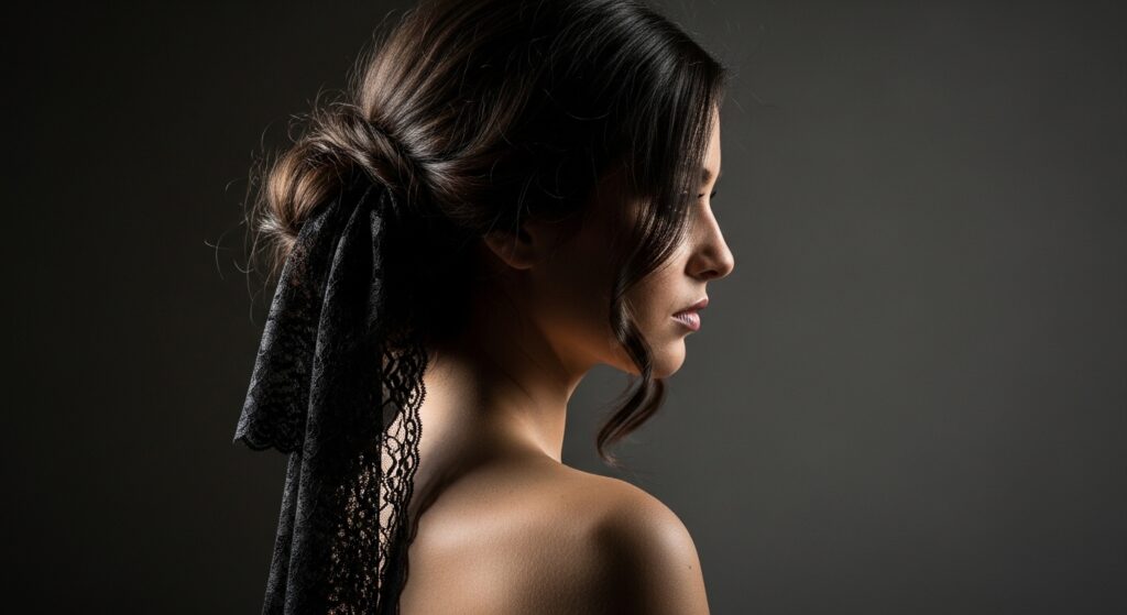 Create a deep side part and a low, twisted bun. Use a long, black lace or velvet scarf. Don’t just wrap it—drape it over one shoulder before wrapping it around the bun, letting some lace drape down artistically.