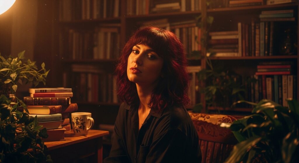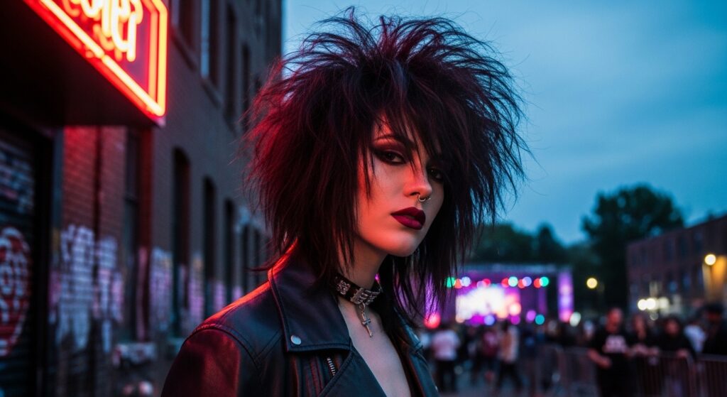 Love a dark, poetic vibe? Enter the romantic goth hairstyles trend. This takes your shaggy bob and adds softer, face-framing layers, curtain bangs, and a touch of vintage curl.
