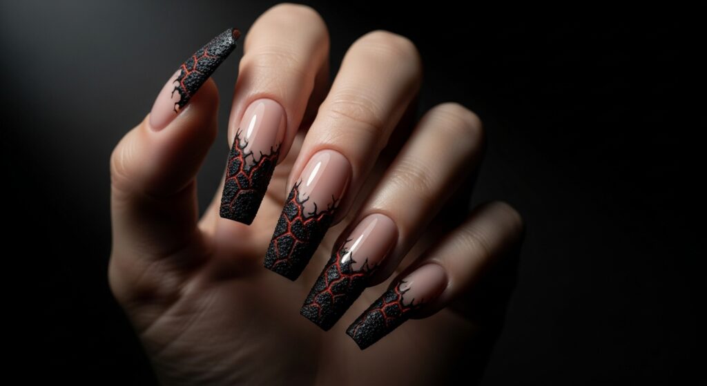 Color plays a crucial role. While monochromatic looks (like all-black or all-white) are powerfully stark, many designs use ombré techniques or contrasting colors to highlight the texture. A deep burgundy fading into a cracked, matte black tip, or a milky nude base ending in a shattered, crystal-clear texture are stunning examples. The finish is almost always matte, as it amplifies the shadows and depth of the texture, making every crack and ridge more visible.