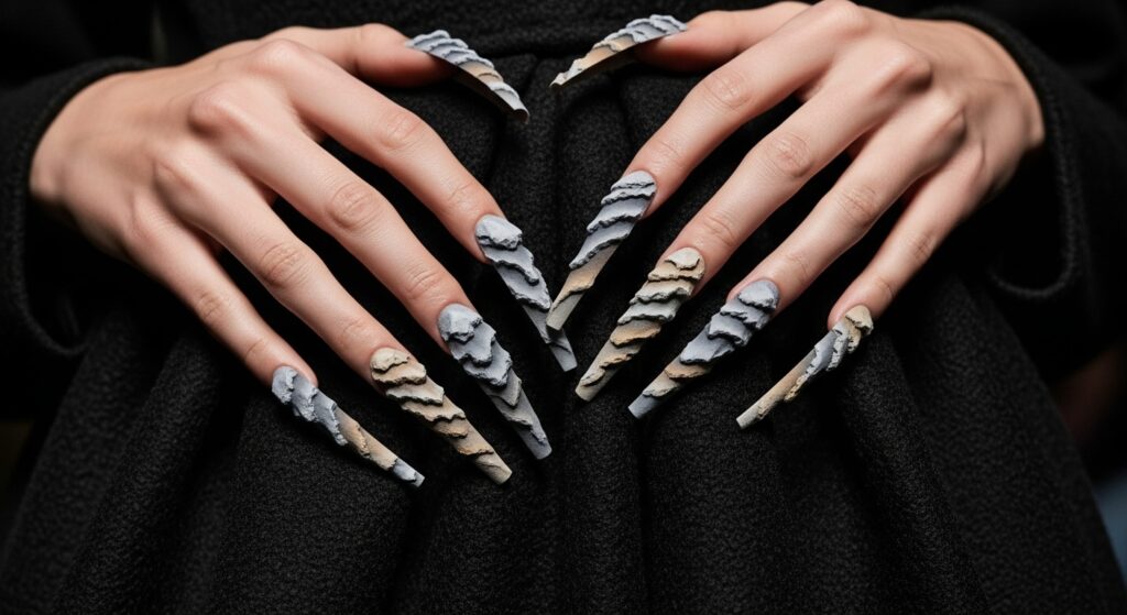 The story of Shattered Ends doesn’t begin at your local nail salon. Its roots are firmly planted in the soil of high fashion and avant-garde artistry. We first saw whispers of this textured future on international runways, where designers’ visions extend beyond clothing to complete bodily aesthetics. Nail artists, acting as sculptors, began experimenting with building out nails using acrylics, gels, and unconventional materials like clay, sand, and even crushed shells to create extreme textures.