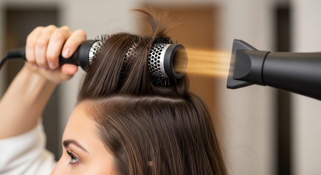 Then, flip back and use a round brush to dry the rest. Direct the airflow down the hair shaft for smoothness. Don’t skip this—it creates the foundational volume that lasts all night.