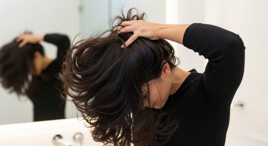 This step is everything for volume. Flip your head upside down and blow-dry your roots about 80% dry. Use your fingers to lift the roots at the scalp.