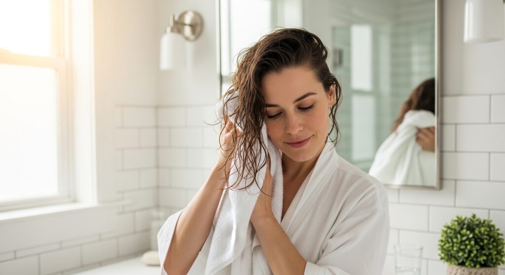 This keeps your roots from getting weighed down. When you towel-dry, gently scrunch your hair—don’t rub. You want to keep the hair’s natural texture as a base for your waves.