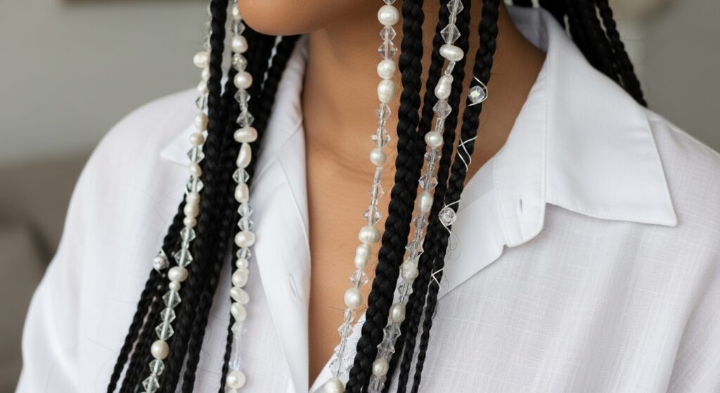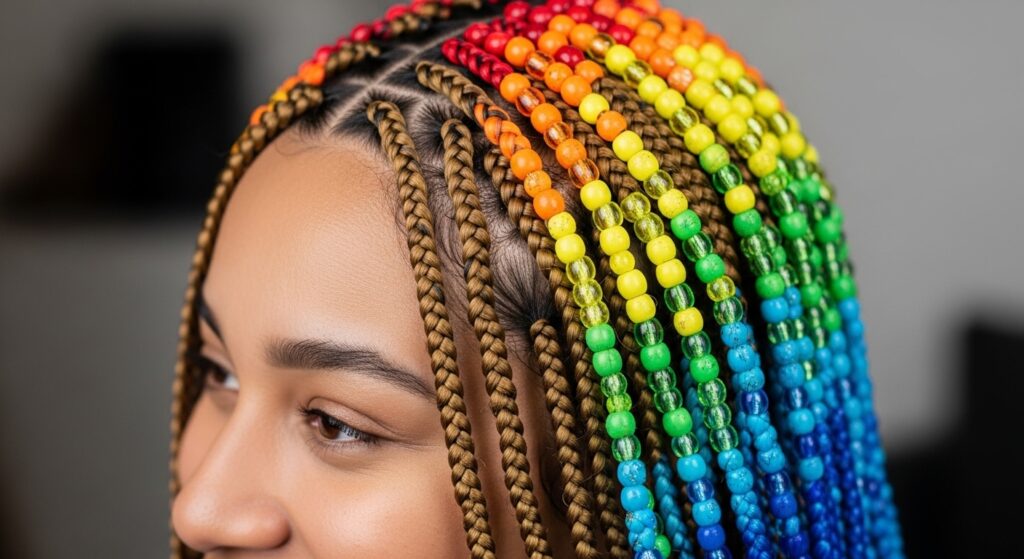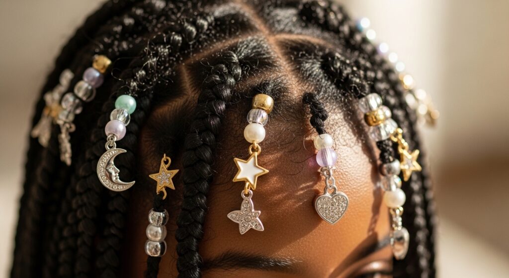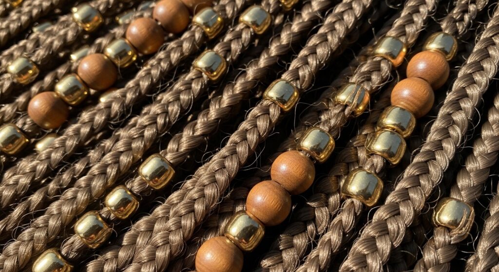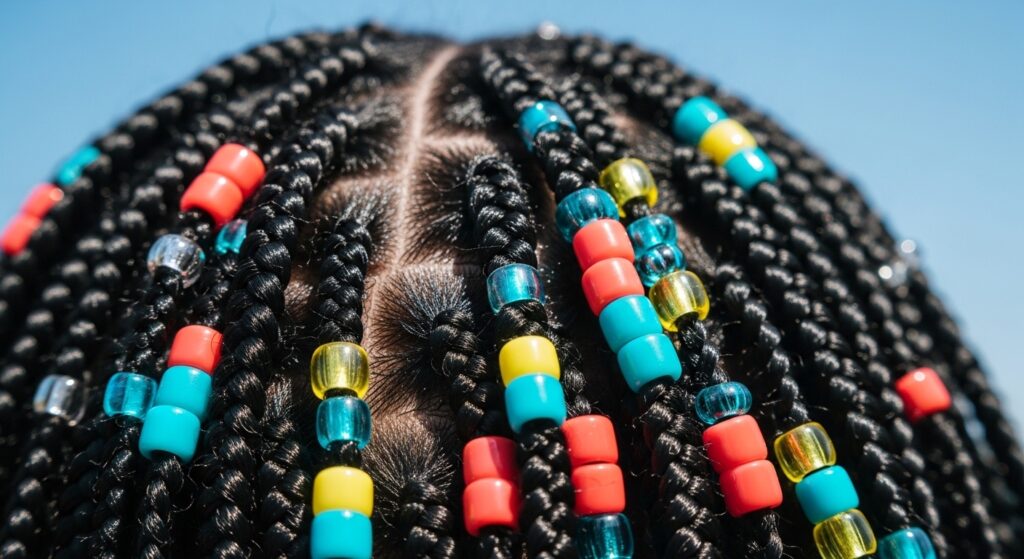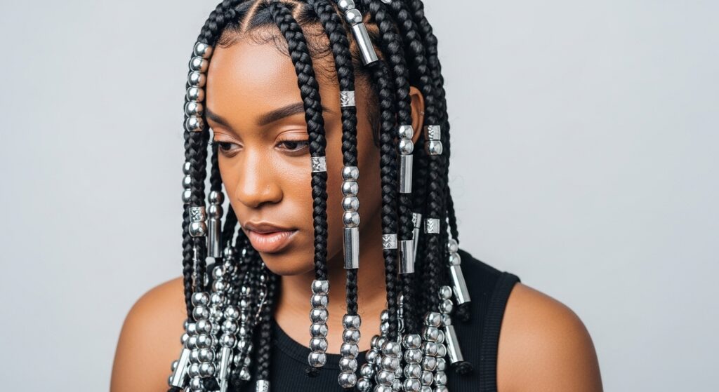 • Monochrome: Beads in the same color family as your braids (black on black, brown on brown). Subtle and chic.