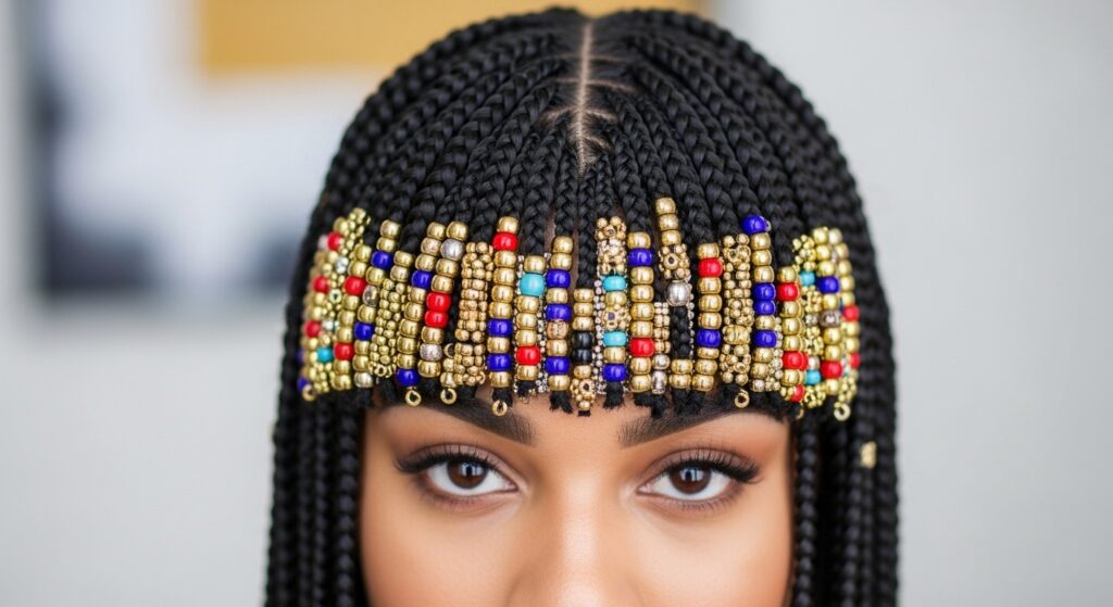 Taking cues from the dramatic hime cut, focus your bead accessories on the front sections of your hair. Style your braids with a straight-across fringe or deep side part.
