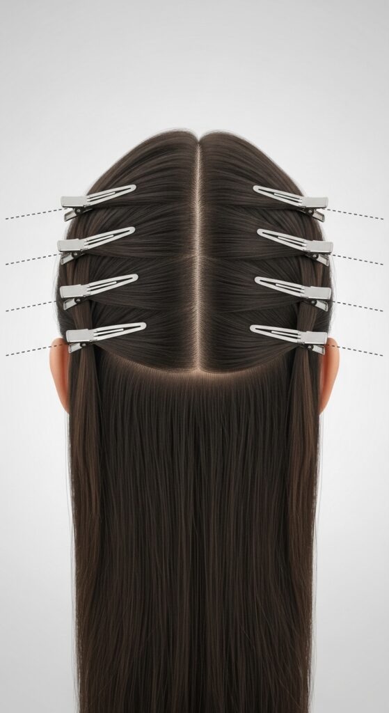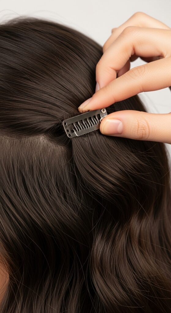Then, work your way outwards, adding the side wefts. Angle them slightly to follow the curve of your head. Each clip should be placed about a half-inch to an inch apart for even support. The goal is security without bulk, so the clips lie as flat as possible.