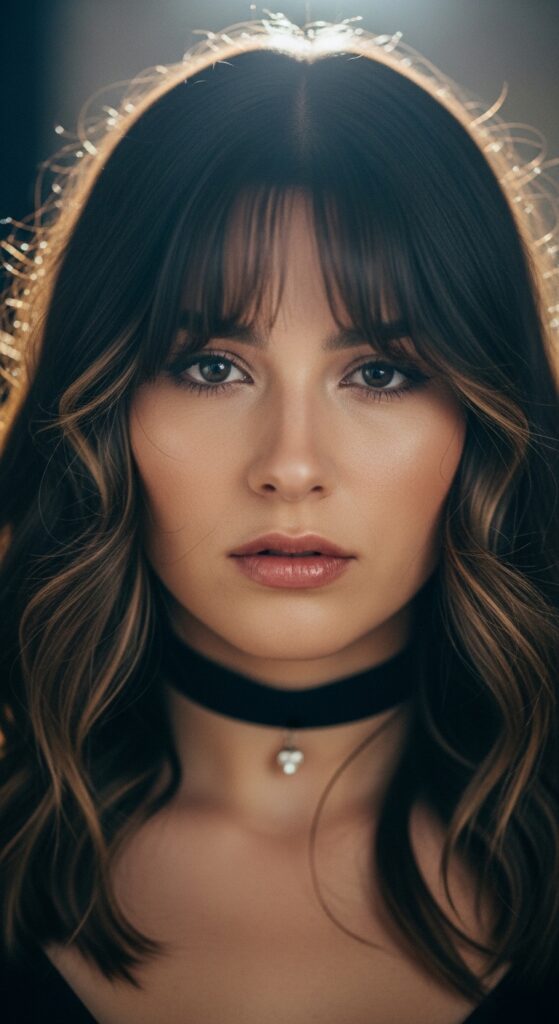 This look is all about lush, dark romance. Think deep waves, volume at the crown, and those face-framing pieces. Your blended bangs are perfect for this. Curl everything together with a large barrel iron for soft, dramatic waves.