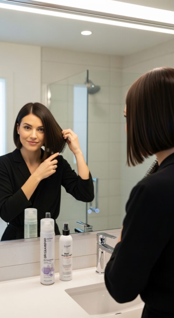 The quiet luxury bob isn’t just a cut—it’s a feeling. With your blended bangs, you can achieve it. Style your hair in a low, loose bun or a simple, sleek blowout. The key is impeccable grooming.
