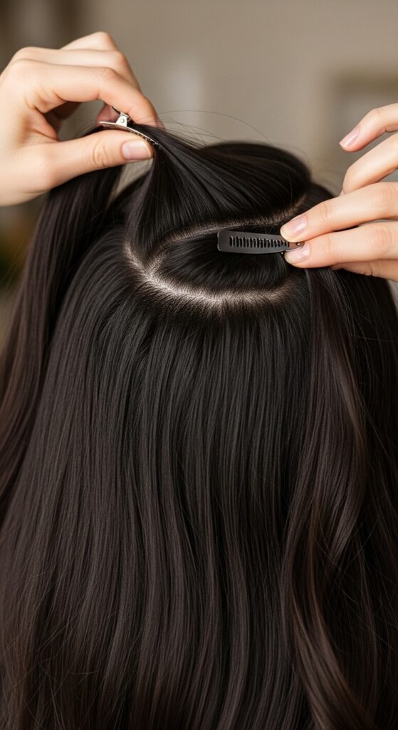 Don’t just clip them on top of your hair! The secret is to create a landing zone. Part your hair where you normally do. Then, take a horizontal section of your own hair about an inch back from your hairline and an inch deep. Gently clip this top section up and out of the way.
