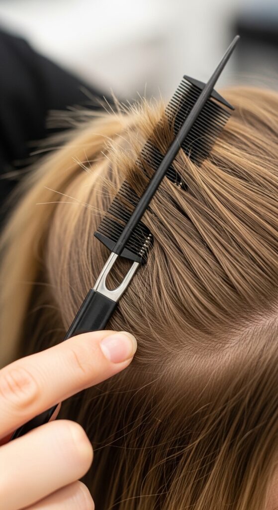 This creates a pocket where the extension wefts will sit flat against your scalp. Your own hair will then be released over them, covering the clips and creating a natural, layered effect. This technique is a non-negotiable for the “illusion” part of illusion length.