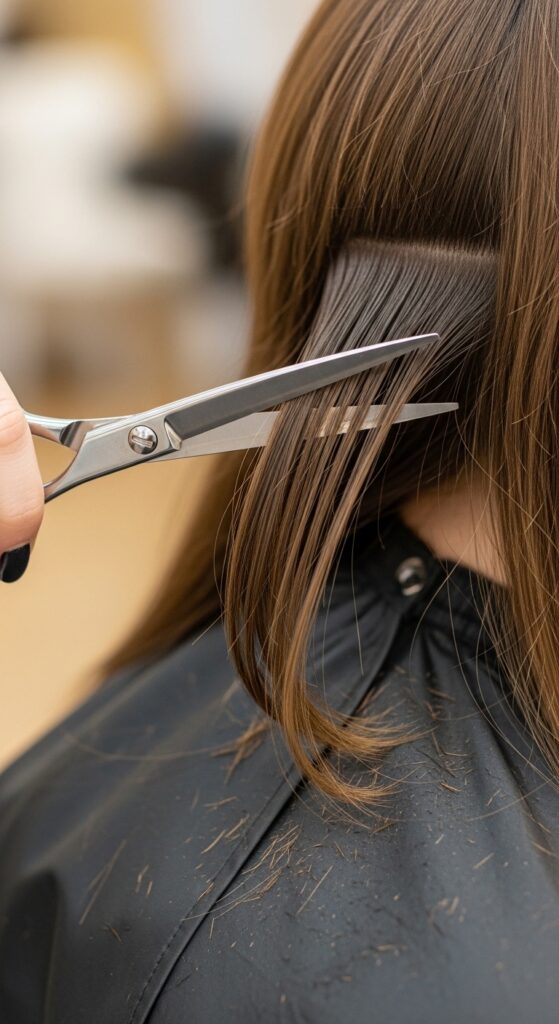 This technique removes weight and creates feathered, broken ends that blend with your own layers. Go slowly and cut less than you think you need. You can always trim more, but you can’t add it back!