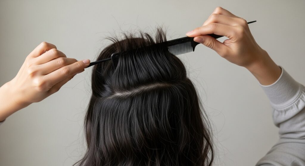Gently smooth the top layer of hair over the teased section. This creates a hidden base of volume that makes the side sweep look fuller and more polished.