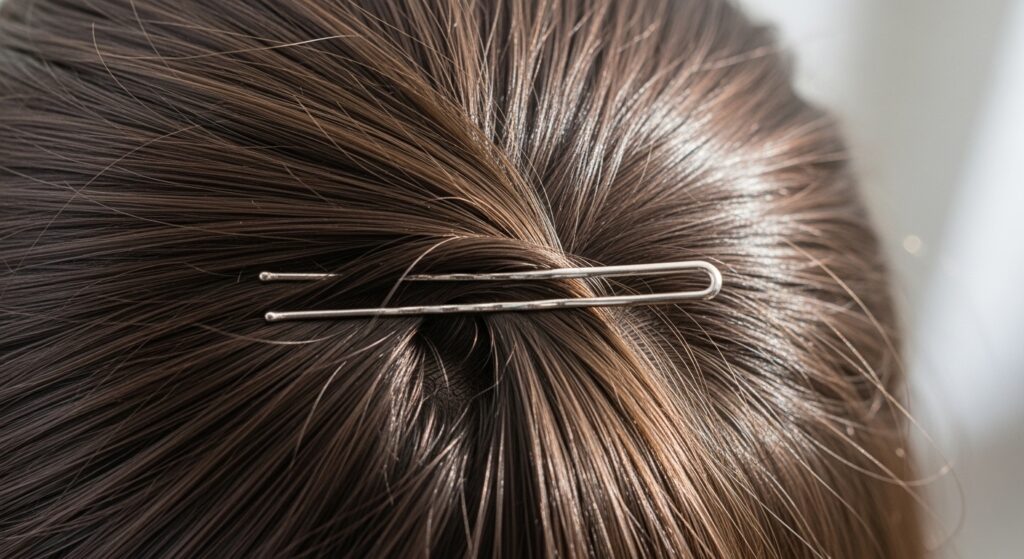 Always pin in the direction the hair is going. If the hair is swept to the right, insert pins pointing to the right. This hides them perfectly.