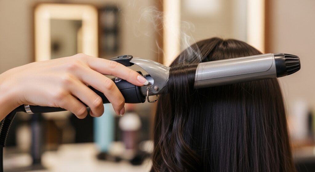Take 1-2 inch pieces and curl away from your face. Hold for 8-10 seconds, then gently release the curl. Don’t touch it yet! Let the curls cool completely in their shape.