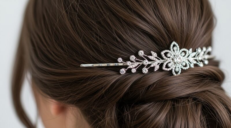If your dress is simple, a bold accessory can be your statement. If your dress is detailed, a simple, elegant pin is perfect. It’s a great way to nod to trends like romantic goth hairstyles with a dark velvet pin or keep it classic.