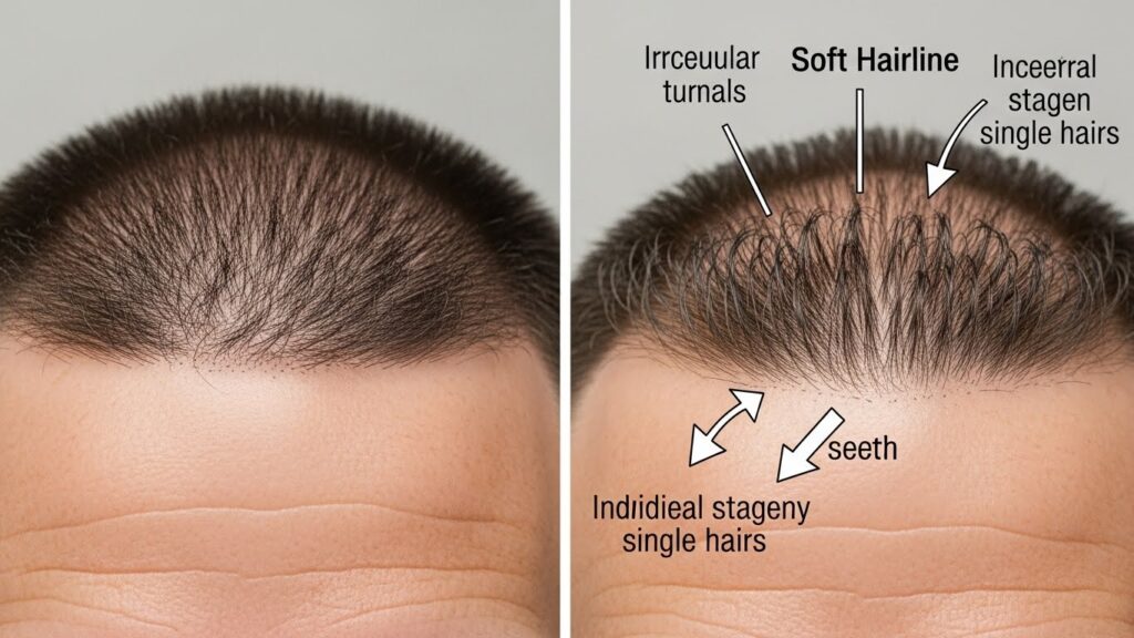 Irregularity: Nature is imperfect. A soft hairline has a subtle, uneven pattern with minor asymmetries, varying hair densities, and a gentle, undulating shape. It avoids the harsh, perfectly rounded or squared-off look of older techniques.