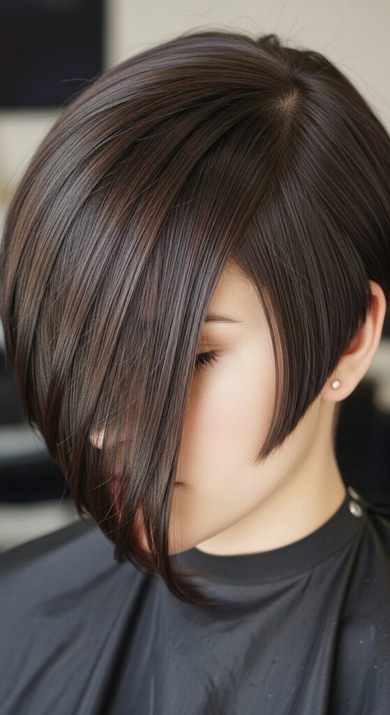 Apply it to dry hair to emphasize the sharpness of the layers and bangs. The goal is deep, reflective shine that looks supernatural in the best way.