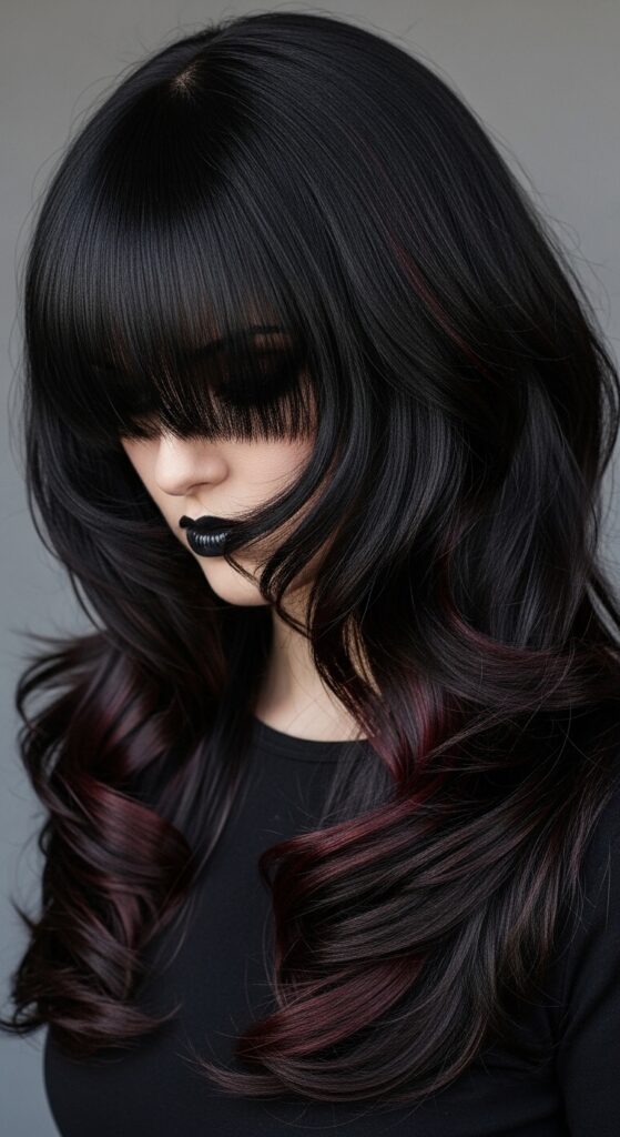 This trend is all about sharp, dramatic layers and often includes heavy, eye-skimming bangs. It’s a bold take on romantic goth hairstyles.