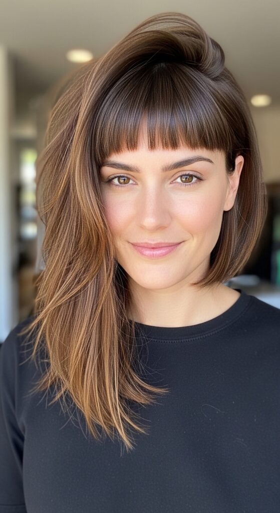 Bangs that are fuller at the temples add width where you need it. Think curtain bangs or brow-skimming fringe that’s a bit longer on the sides.