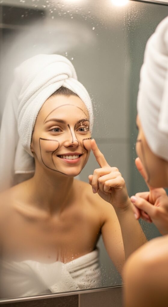 - Trace the outline of your face with a lipstick or dry-erase marker on the mirror.