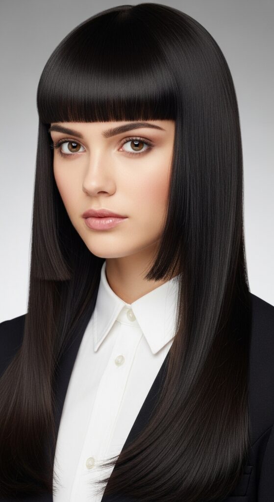 The hime cut, with its straight-across bangs and long, straight side locks, is strikingly beautiful. It requires commitment to a blunt line.