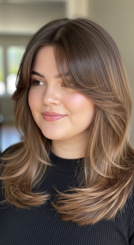 Side-swept bangs, curtain bangs, or even wispy fringe are perfect. They camouflage the width of the forehead gently.
