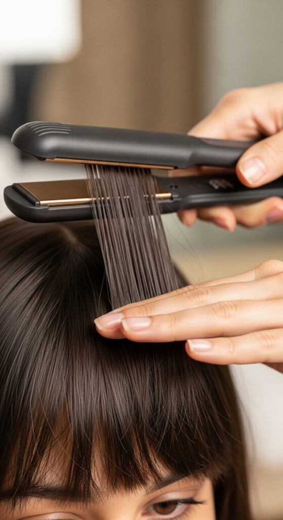 Styling is about sleek precision. A flat iron is essential to keep every section—bangs and long front pieces—smooth and sharp.
