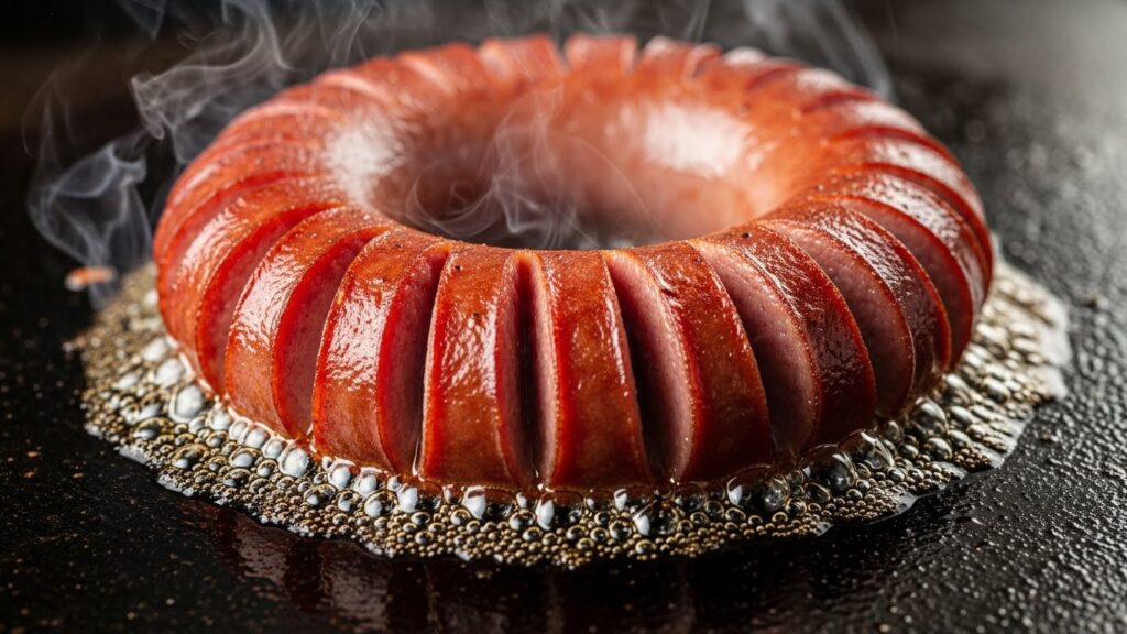 First, take your slab of ring bologna and, using a sharp knife, make four shallow cuts from the edge toward the center, spaced evenly around the circumference. This scoring is your ticket to a flat, evenly cooked disc. Heat your griddle or heavy skillet over medium heat—no extra oil needed. Place the scored bologna on the hot surface. Listen for that glorious sizzle. Fry for 3-4 minutes per side, until a deep, mahogany-brown crust forms.