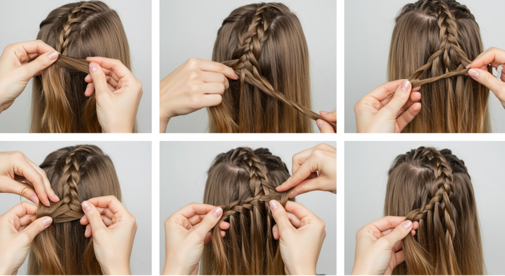 With each crossover, pick up a small section of hair from the side and incorporate it into the braid.