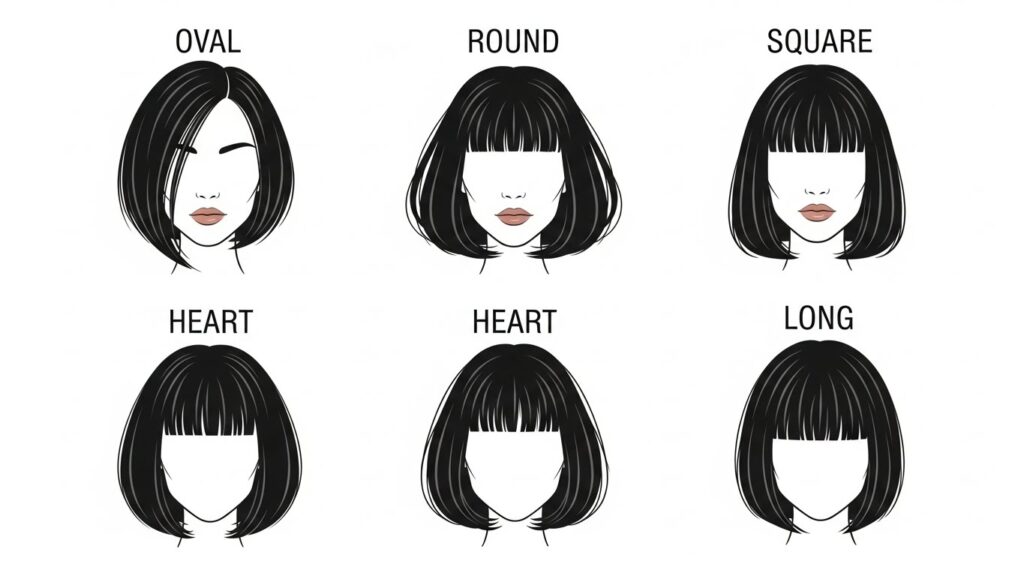 For Heart-Shaped Faces: A chin-length bob is perfect for balancing a wider forehead and a narrower chin. A full, blunt fringe or side-swept bangs can soften the forehead, while keeping the length at the chin adds width to the lower part of the face, creating a harmonious balance.
