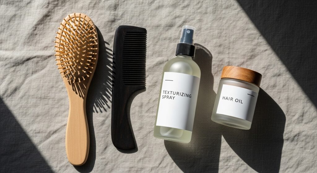 The Products: Think lagom here, too. A good texturizing spray, a flexible-hold mousse for volume, and a lightweight hair oil for shine are often all you need. Avoid heavy, coating products that will weigh down the precise shape.