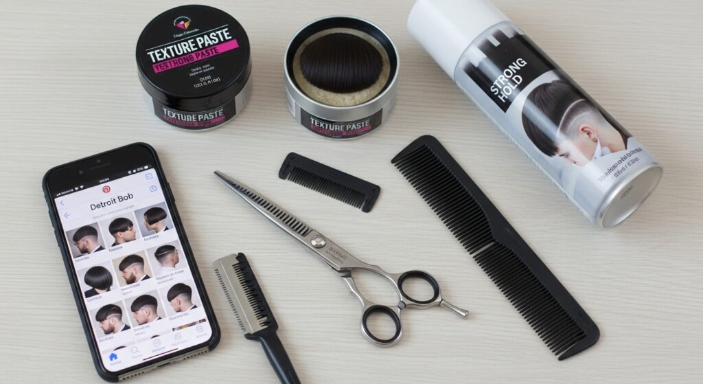 Walking into a salon and asking for a “bob” won’t get you this specific look. Communication is key. Come prepared with visuals, but also be ready to describe the feel as much as the shape. Use phrases like: “architectural and sharp,” “piece-y texture, not soft layers,” “Motor City or rock ‘n’ roll edge,” “sleek but not glossy,” and “strong, geometric lines.” Mention inspiration like industrial design, vintage automotive chrome, or Detroit’s music scene.