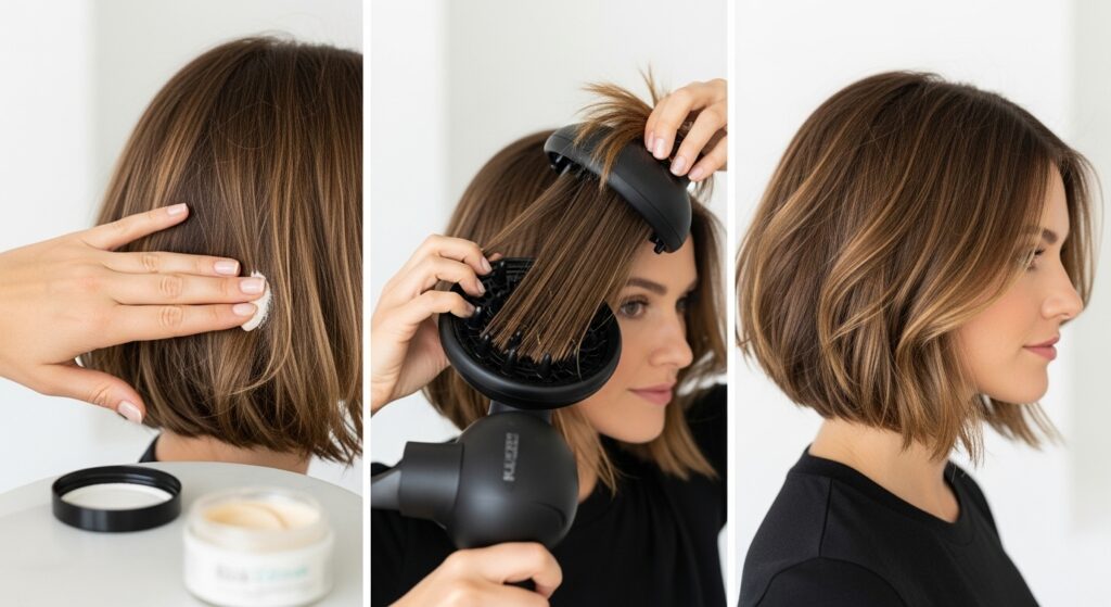 The Detroit Bob’s beauty is in its versatility and wearability. For a sleek, sharp look, blow-dry with a round brush, directing the hair under to create a smooth, inverted curve. Finish with a light serum for shine. To amp up the signature texture, apply a texturizing paste or sea salt spray to damp or dry hair. Scrunch the ends with your fingers as you blow-dry with a diffuser or let it air dry for a more effortless, undone finish.