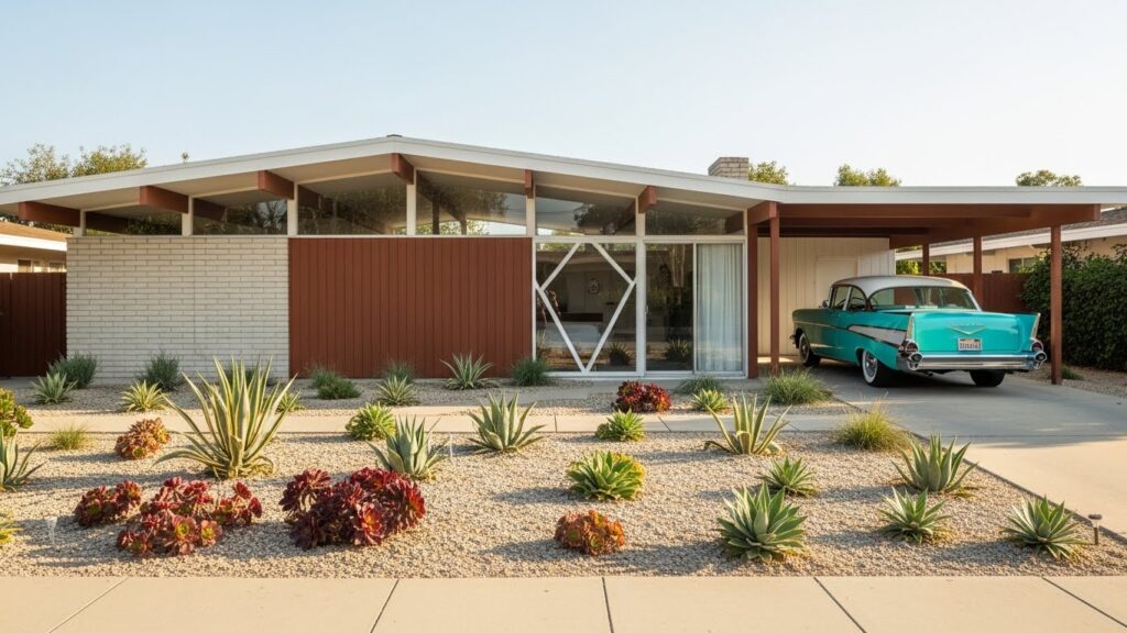 Integration with the Outdoors: Even on modest lots, the design encouraged outdoor living. Concrete patios, often covered by the eave’s extension, functioned as additional “rooms.” Landscaping tended to be low-maintenance, using native rocks, concrete planters, and hardy shrubs like oleander or juniper.