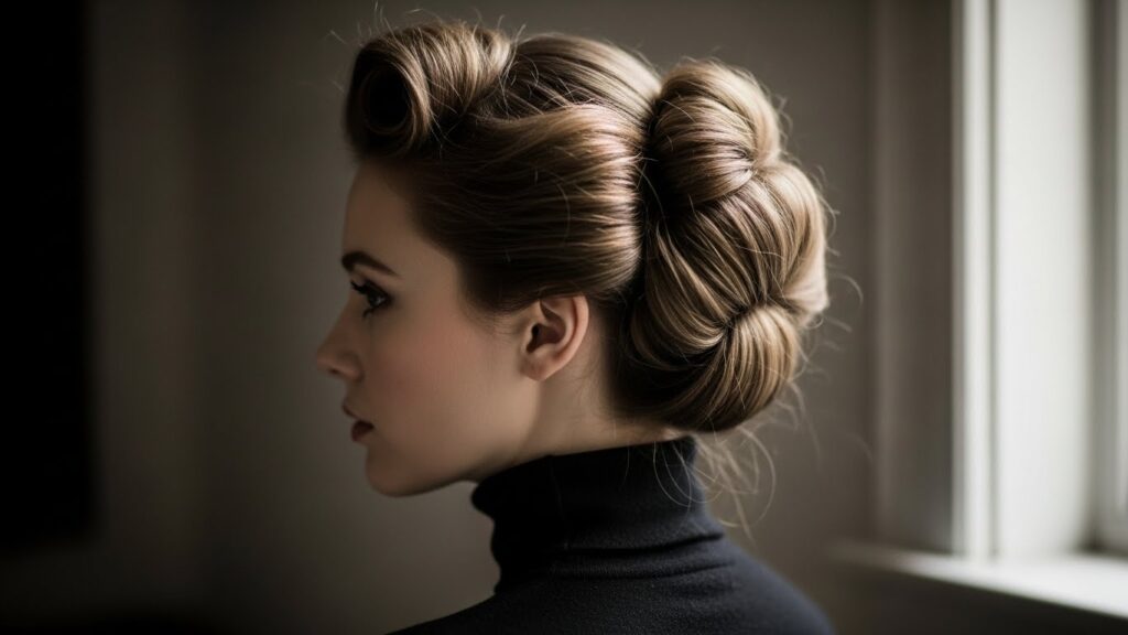 Step 5: Final Touches. Gently pull at the sides of your rolled pouf to soften and balance it. Spritz with a light-hold hairspray to tame any flyaways. For a truly authentic touch, you can secure the style by sliding a decorative hair stick or even a pencil through the roll and the base of the tuck.