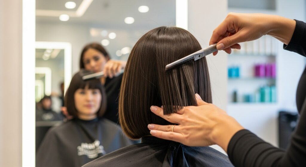 “I want a collarbone-length bob with soft, blended layers.” This sets the length and the layering technique.