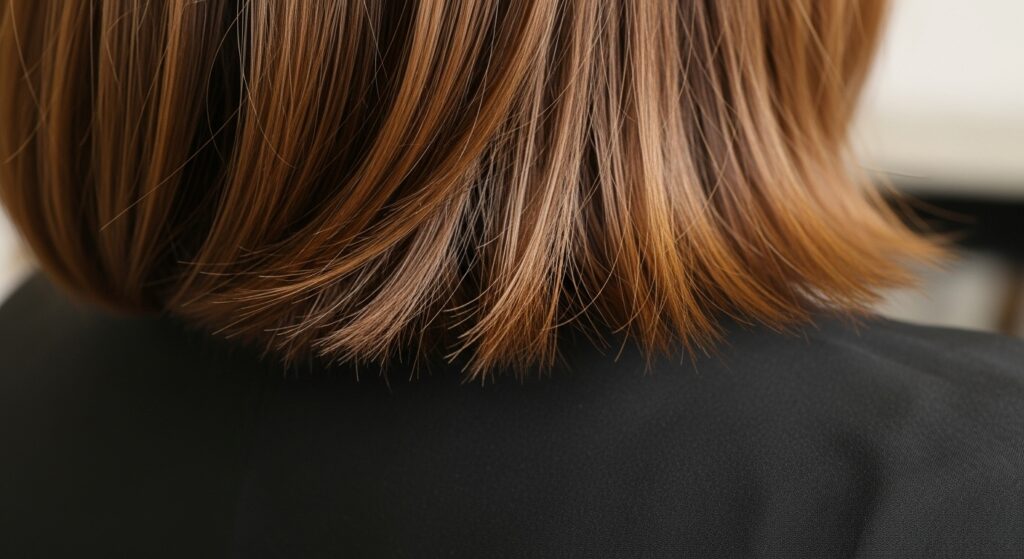 The “Shattered” Ends: The hemline isn’t a blunt, solid line. It’s point-cut or razored to create a broken, textured finish that looks airy and light, preventing any harshness.