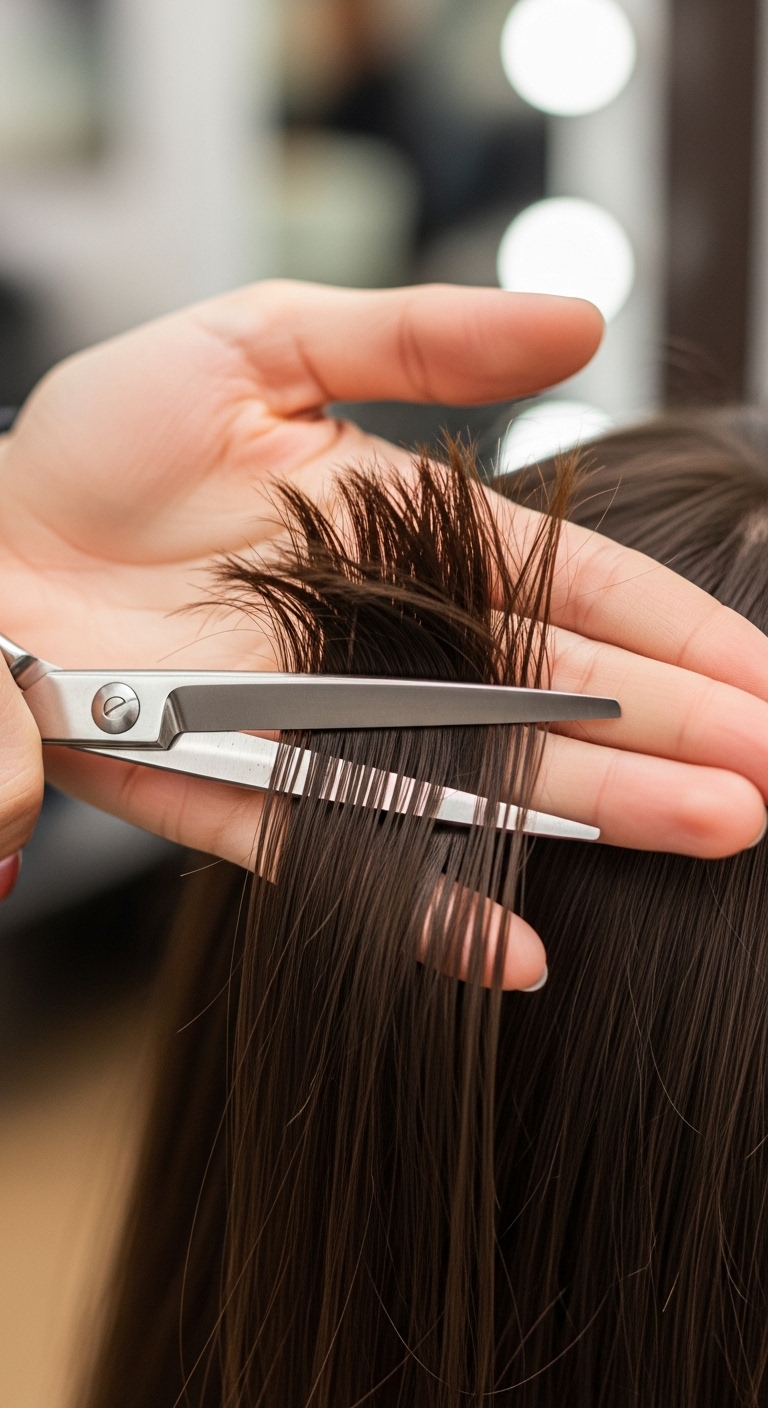 “Please point-cut or razor the ends for a shattered, textured finish—no blunt lines.” This is crucial for that undone hemline.