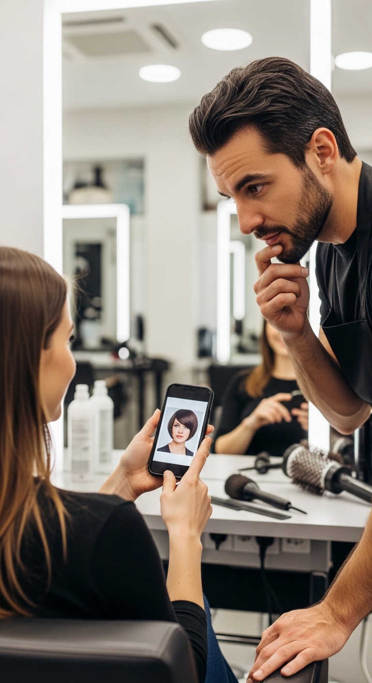 “I want a collarbone-length bob with soft, blended layers.” This sets the length and the layering technique.