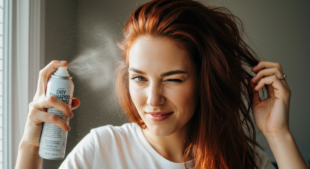 - Dry shampoo is your BFF. Spray it at the roots before bed to absorb oil overnight.