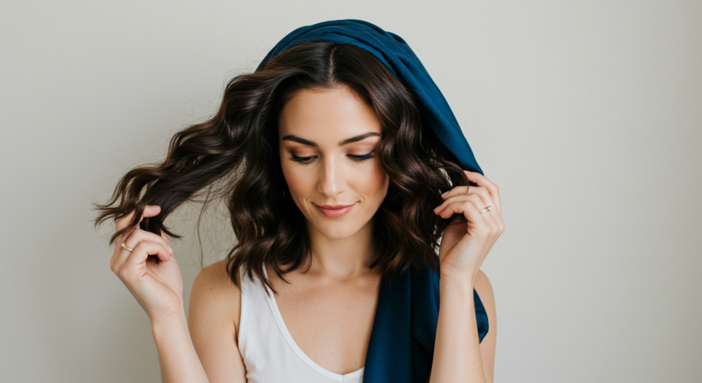 - Overnight curls: Wrap damp hair in a silk scarf or use soft rollers before bed.
