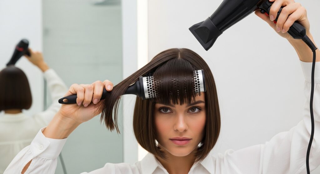 4. The Blow-Dry Strategy: For maximum volume and a sharp line, blow-dry your hair in sections. Start by flipping your head upside down and drying the roots until they are about 80% dry. This lifts the roots. Then, flip back and use a round brush to dry the rest. Pull each section straight down, tensioning the hair with the brush as you direct the blow-dryer nozzle downward. This technique smooths the cuticle and ensures that iconic, sharp, swinging line.