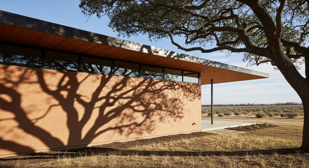 Material Mix (Rustic Meets Refined): Smooth, unadorned stucco panels might sit alongside rough-sawn vertical wood siding. A sleek, floor-to-ceiling brick fireplace could be paired with exposed ceiling beams. This mix speaks to both modern tastes and the region’s agricultural identity.